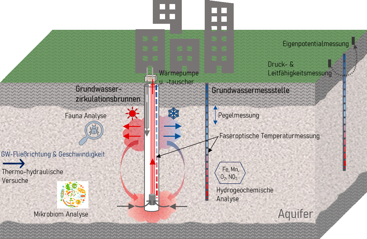Umgesetzt wird ein Grundwasserzirkulationsbrunnen (GWZB): Grundwasserförderung und -injektion finden im selben Bohrloch statt. Das Grundwasser wird am unteren Ende der Brunnenanlage aufgenommen und über das Innenrohr zur Wärmepumpe geleitet.
