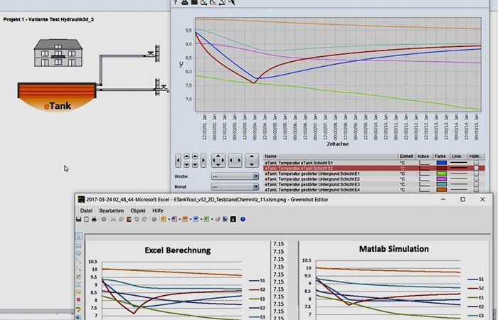 Die Ergebnisse dieser Software bilden eine wichtige Grundlage für die Entwicklung von Regelstrategien für Smart-Grid-fähige Wärmepumpen. Ziel ist es, Stromspitzen und -täler im Smart Grid auszugleichen. Die Simulation berücksichtigt dazu stundenweise Klimadaten sowie die entsprechende zugeführte oder entzogene Wärmemenge auf den relevanten Temperaturniveaus. Die genaue Simulation ermöglicht eine präzise Dimensionierung der Erdspeichersysteme und hilft, Überdimensionierungen zu vermeiden. Zudem erlaubt sie die Identifikation optimaler Geometrien und Beladestrategien, um einerseits überschüssige Solarthermie aus den Sommermonaten in die Winterperiode zu übertragen und andererseits eine passive Kühlung im Sommer zu gewährleisten. Das thermische Verhalten von geothermischen Systemen, einschließlich des eTanks, lässt sich mit der entwickelten Software präzise beschreiben.